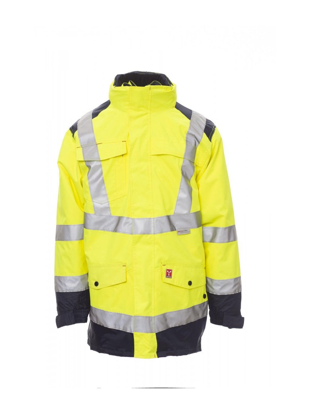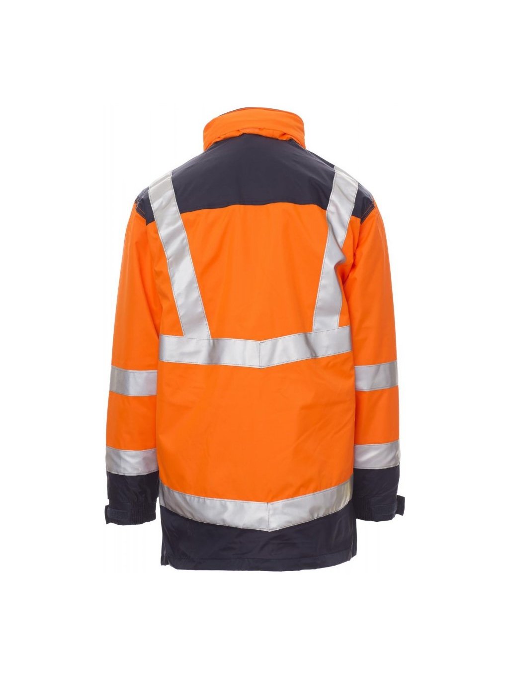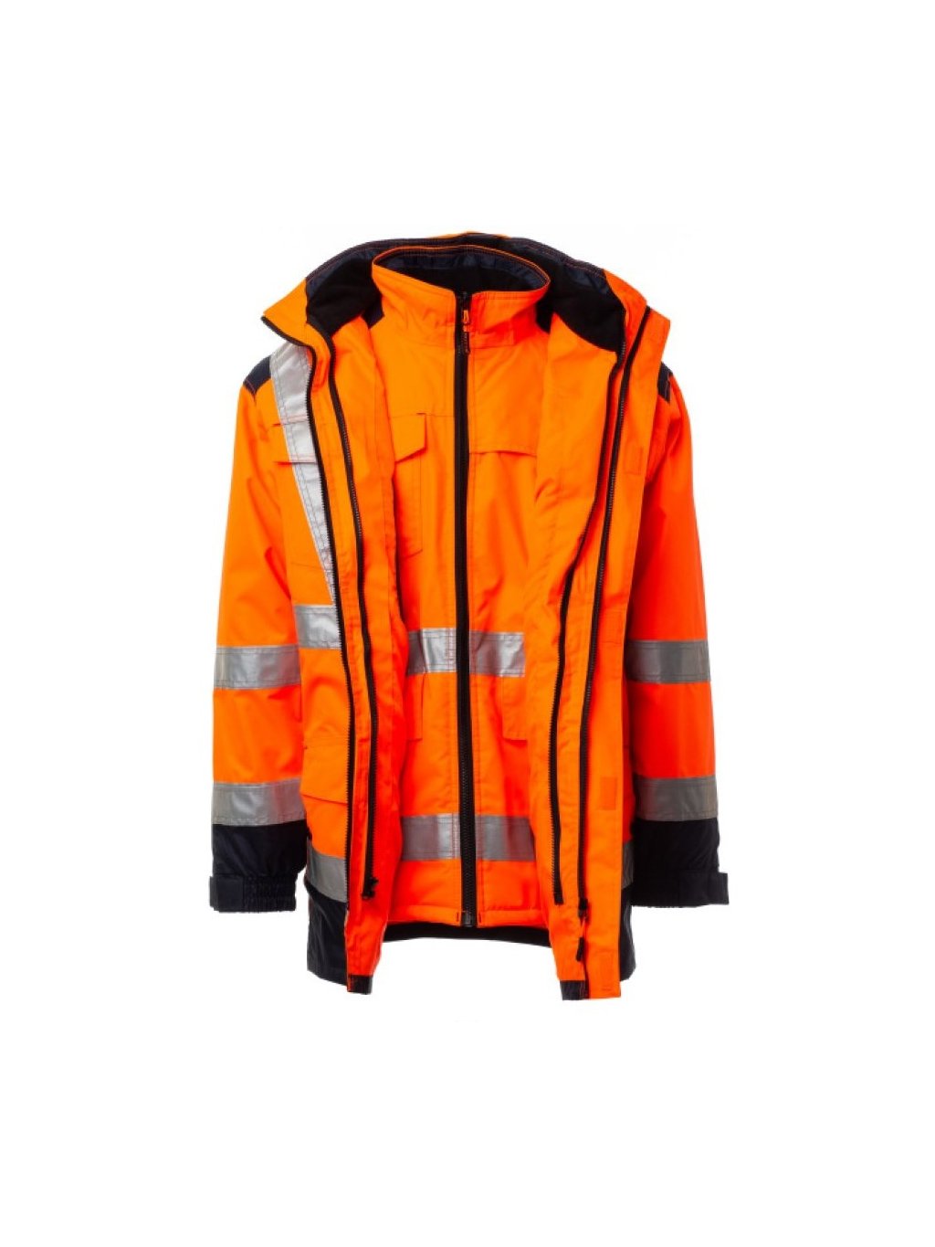 Dvojfarebná parka 4 v 1, s vysokou viditeľnosťou vďaka odrazovým pásom. Vonkajšia bunda bez podšívky, plastový zips s kovovým bežcom, krytý chlopňou a suchým zipsom; odnímateľná a/alebo skladacia kapucňa so šnúrkou, nastaviteľné pružné manžety. 4 predné vrecká: na pravej strane so suchým zipsom, s držiakom na perá a zasúvateľným držiakom na preukazy; na ľavej strane je zips; 2 spodné so zipsom, patentkou a bočným otvorom. Švy prekryté termoprúžkom. Krátka bunda s výplňou a odnímateľnými rukávmi, plastový zips s kovovým bežcom, pružná manžeta. 4 predné vrecká: na ľavej strane so suchým zipsom, s držiakom na perá a zasúvateľným držiakom na preukazy; na ľavej strane je zips; 2 spodné so suchým zipsom. Na oboch: golier a plecia z mikroflísu, zips na uľahčenie aplikácie potlače a výšivky, dva pásy na hrudníku, pleciach a rukávoch.