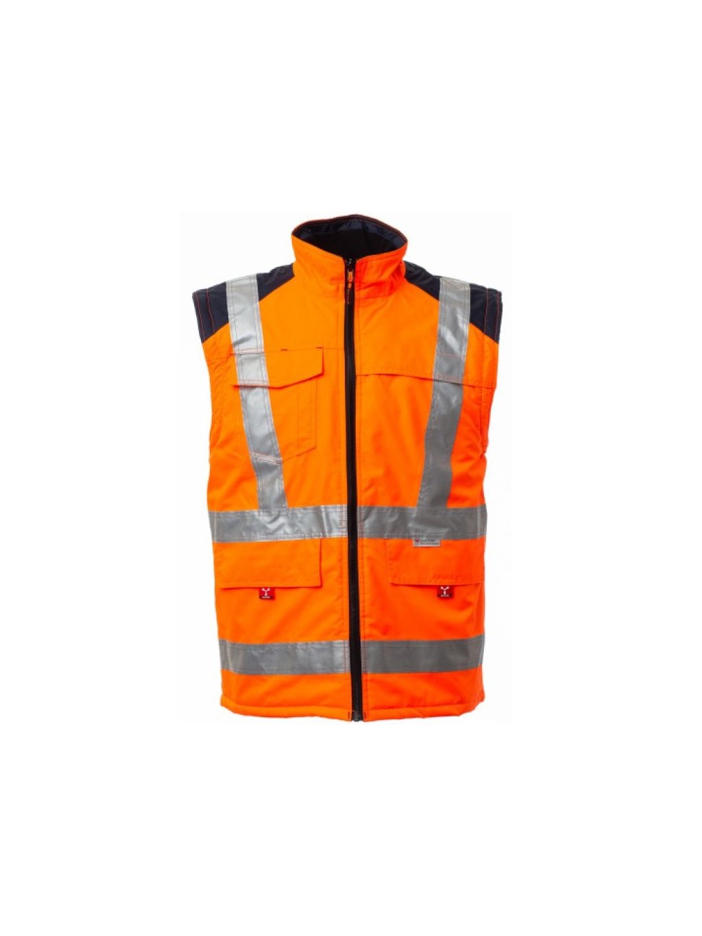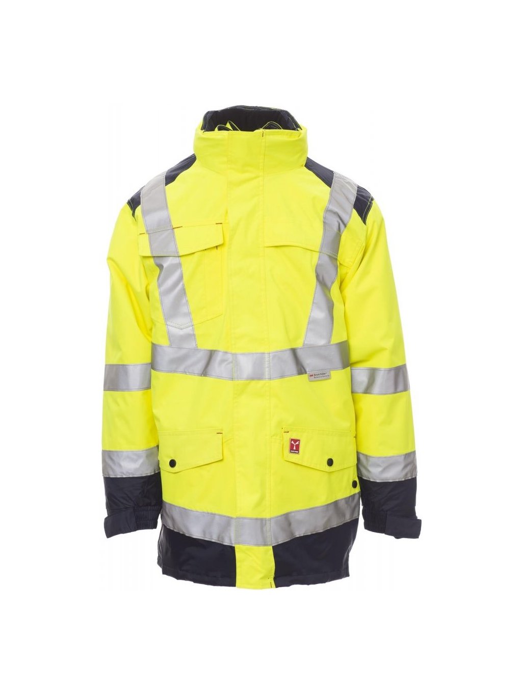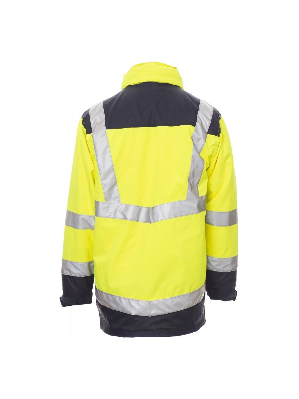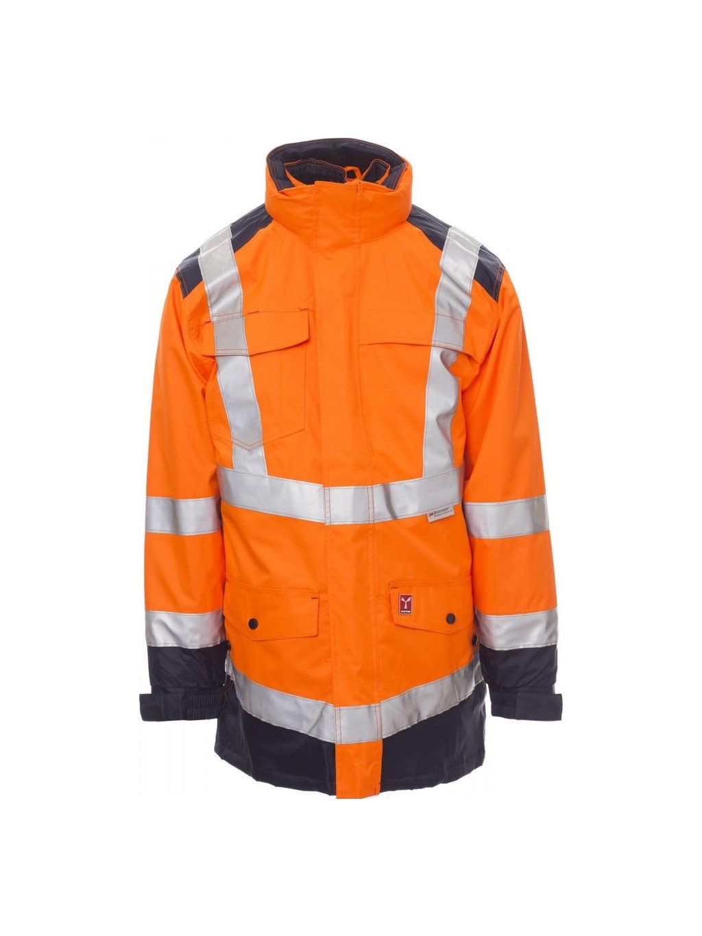Dvojfarebná parka 4 v 1, s vysokou viditeľnosťou vďaka odrazovým pásom. Vonkajšia bunda bez podšívky, plastový zips s kovovým bežcom, krytý chlopňou a suchým zipsom; odnímateľná a/alebo skladacia kapucňa so šnúrkou, nastaviteľné pružné manžety. 4 predné vrecká: na pravej strane so suchým zipsom, s držiakom na perá a zasúvateľným držiakom na preukazy; na ľavej strane je zips; 2 spodné so zipsom, patentkou a bočným otvorom. Švy prekryté termoprúžkom. Krátka bunda s výplňou a odnímateľnými rukávmi, plastový zips s kovovým bežcom, pružná manžeta. 4 predné vrecká: na ľavej strane so suchým zipsom, s držiakom na perá a zasúvateľným držiakom na preukazy; na ľavej strane je zips; 2 spodné so suchým zipsom. Na oboch: golier a plecia z mikroflísu, zips na uľahčenie aplikácie potlače a výšivky, dva pásy na hrudníku, pleciach a rukávoch.
