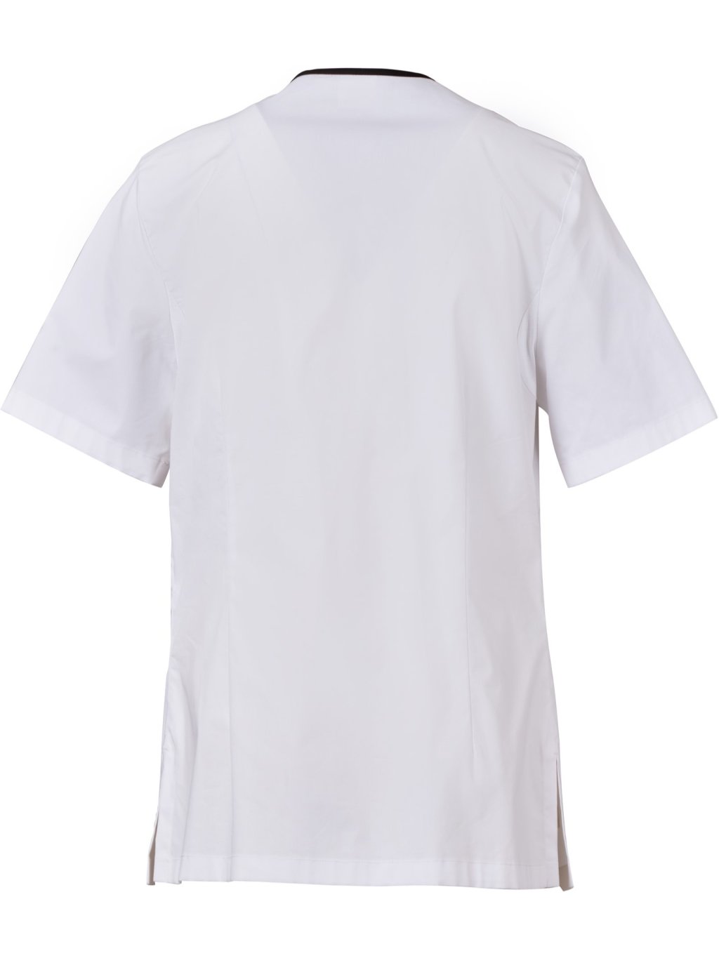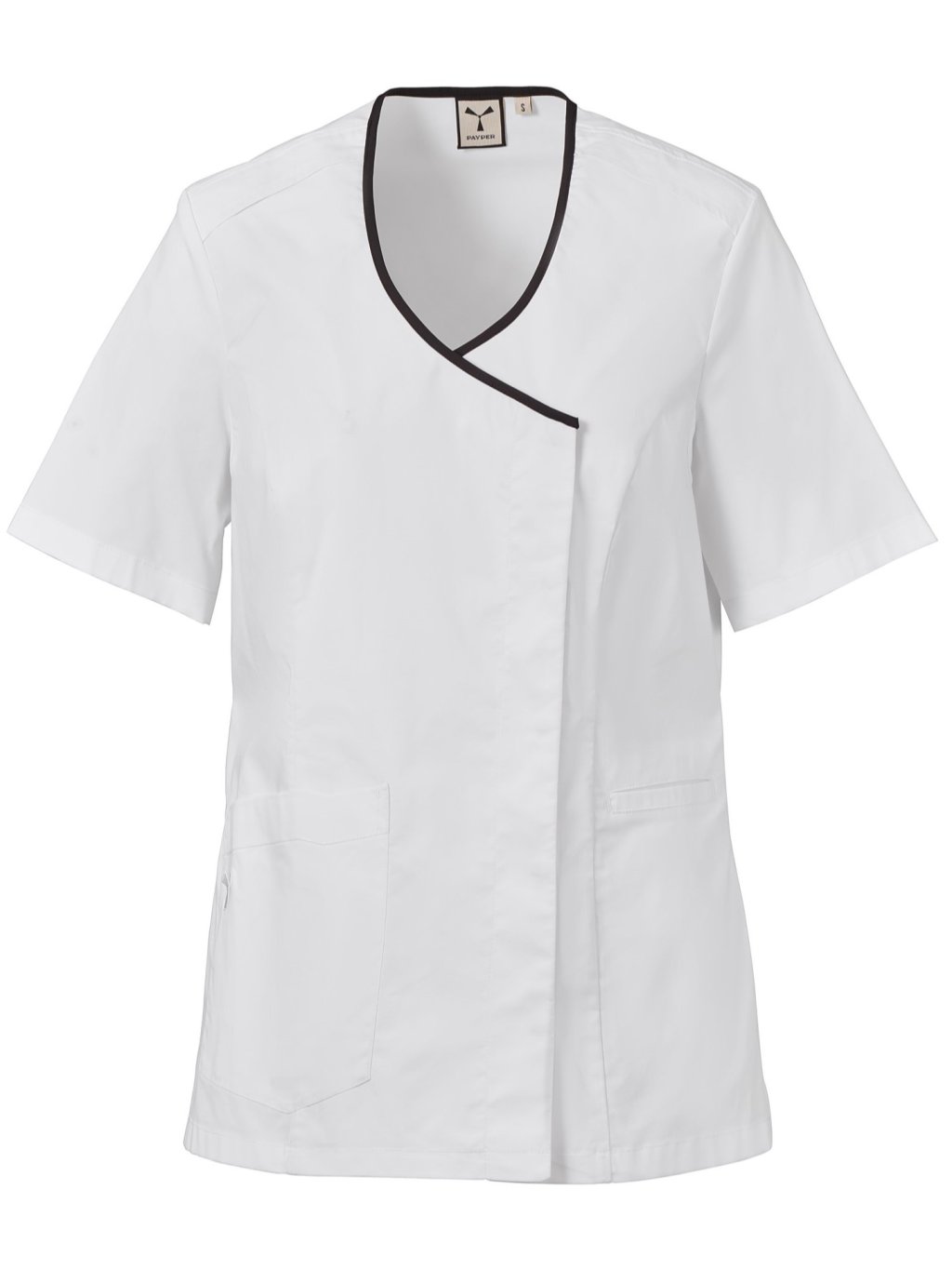Dámska blúzka s krátkym rukávom, zo zmesovej tkaniny bavlneného popelínu, polyesteru a vlákna Lycra® T400®, s vynikajúcimi vlastnosťami, čo sa týka pružnosti a priedušnosti. Výstrih do V s lemom kontrastnej farby. Zapínanie na skryté patentné gombíky a polmesiacovou vložkou pod pazuchami z ľahkej sieťoviny na podporu priedušnosti. Dve vrecká v spodnej časti: jedno všité vrecko a jedno našité s vyšitou ikonou vrtule rovnakej farby. Bočné rozparky a záhyby so zášivkami na chrbte.