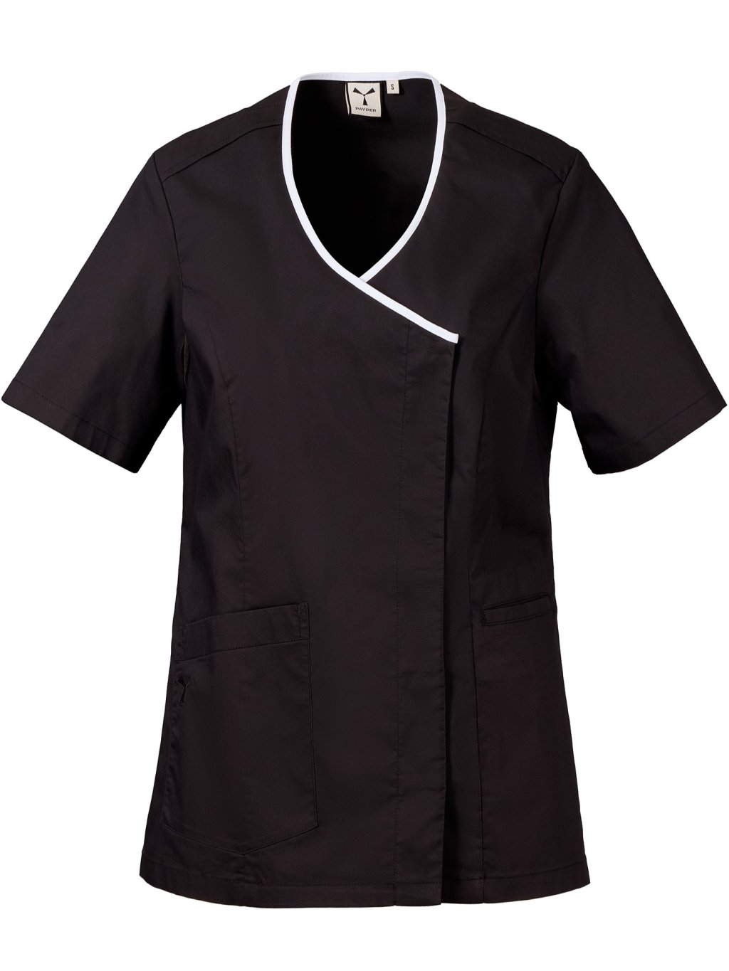 Dámska blúzka s krátkym rukávom, zo zmesovej tkaniny bavlneného popelínu, polyesteru a vlákna Lycra® T400®, s vynikajúcimi vlastnosťami, čo sa týka pružnosti a priedušnosti. Výstrih do V s lemom kontrastnej farby. Zapínanie na skryté patentné gombíky a polmesiacovou vložkou pod pazuchami z ľahkej sieťoviny na podporu priedušnosti. Dve vrecká v spodnej časti: jedno všité vrecko a jedno našité s vyšitou ikonou vrtule rovnakej farby. Bočné rozparky a záhyby so zášivkami na chrbte.