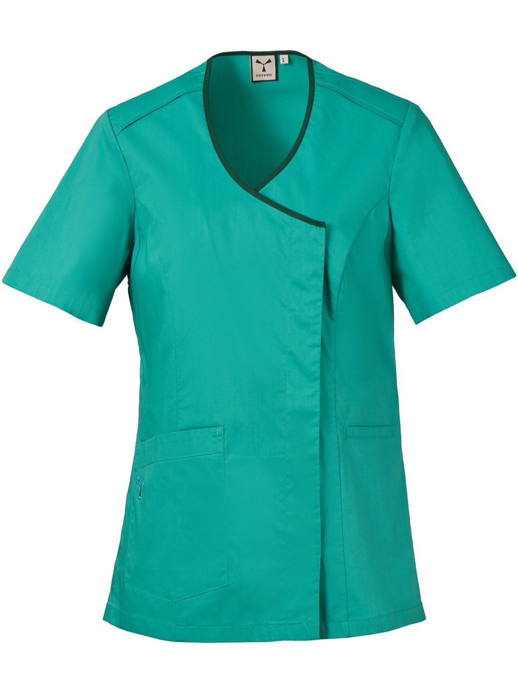 Dámska blúzka s krátkym rukávom, zo zmesovej tkaniny bavlneného popelínu, polyesteru a vlákna Lycra® T400®, s vynikajúcimi vlastnosťami, čo sa týka pružnosti a priedušnosti. Výstrih do V s lemom kontrastnej farby. Zapínanie na skryté patentné gombíky a polmesiacovou vložkou pod pazuchami z ľahkej sieťoviny na podporu priedušnosti. Dve vrecká v spodnej časti: jedno všité vrecko a jedno našité s vyšitou ikonou vrtule rovnakej farby. Bočné rozparky a záhyby so zášivkami na chrbte.