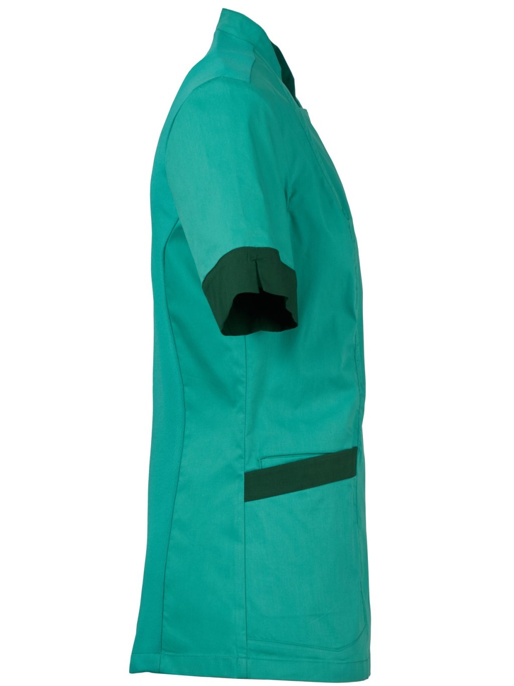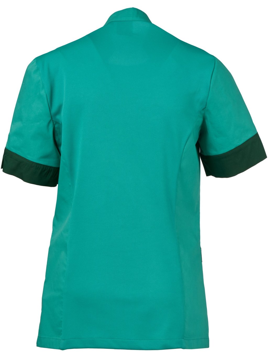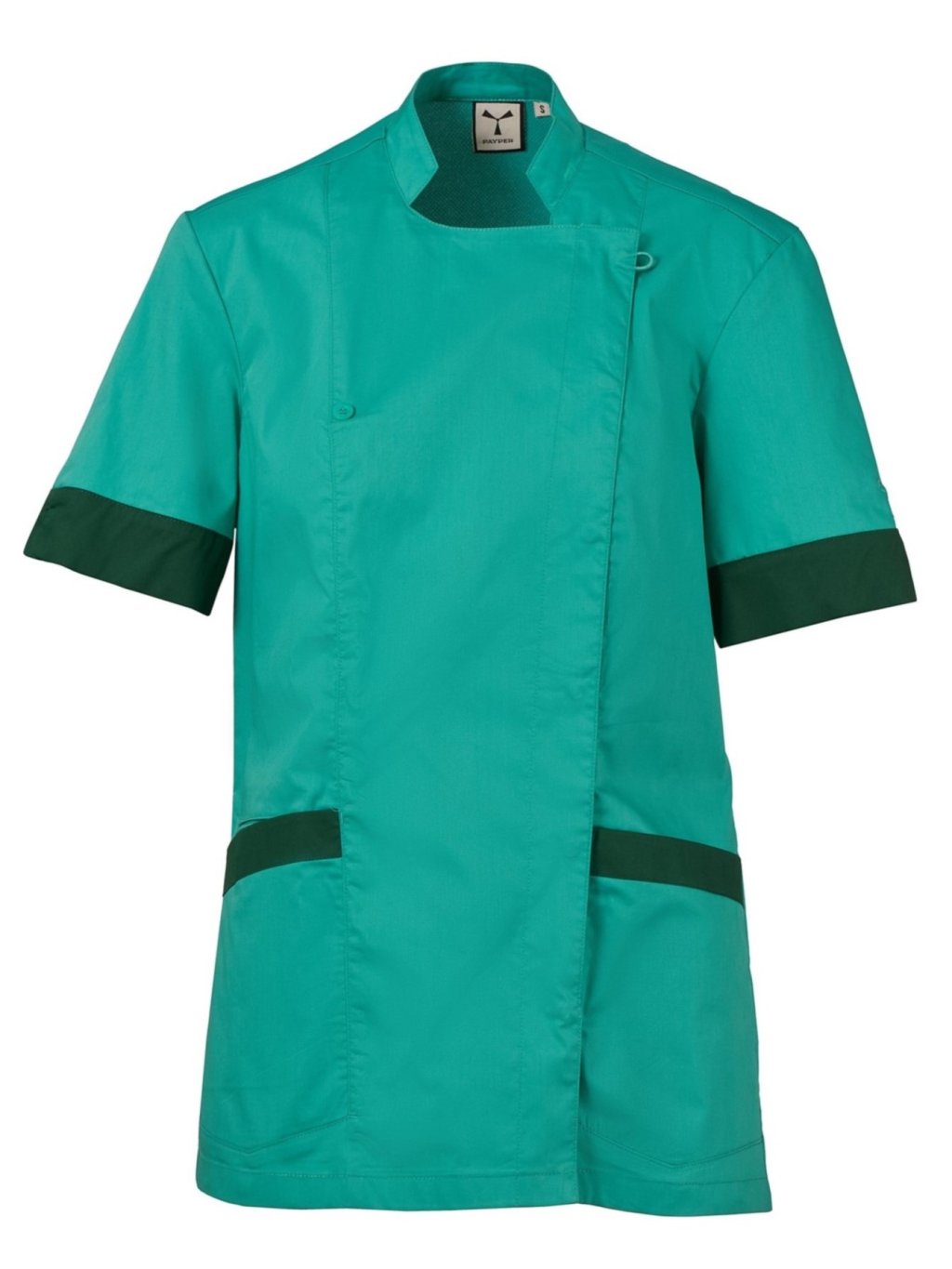 Dámsky tunika s krátkymi rukávmi so stojačikom, zo zmesovej tkaniny bavlneného popelínu, polyesteru a vlákna Lycra® T400®, v kombinácii s pohodlnou sieťovinou na chrbte zaručuje maximálnu priedušnosť a voľnosť pohybu. Dvojradové zapínanie na patentné gombíky, s lemom, ktorý sa dá zahnúť a pripevniť na hrudi viazačkou a viditeľným gombíkom, čím sa vytvára efekt elegantnej chlopne a inovatívneho výstrihu do V. Kontrastná farba na lemoch rukávov a okrajoch vreciek. Dve vrecká v spodnej časti, z toho jedna s držiakom na smartfón. Ikona vrtule Payper vyšitá rovnakou farbou na rukáve. Záhyby so záševkami na chrbte.