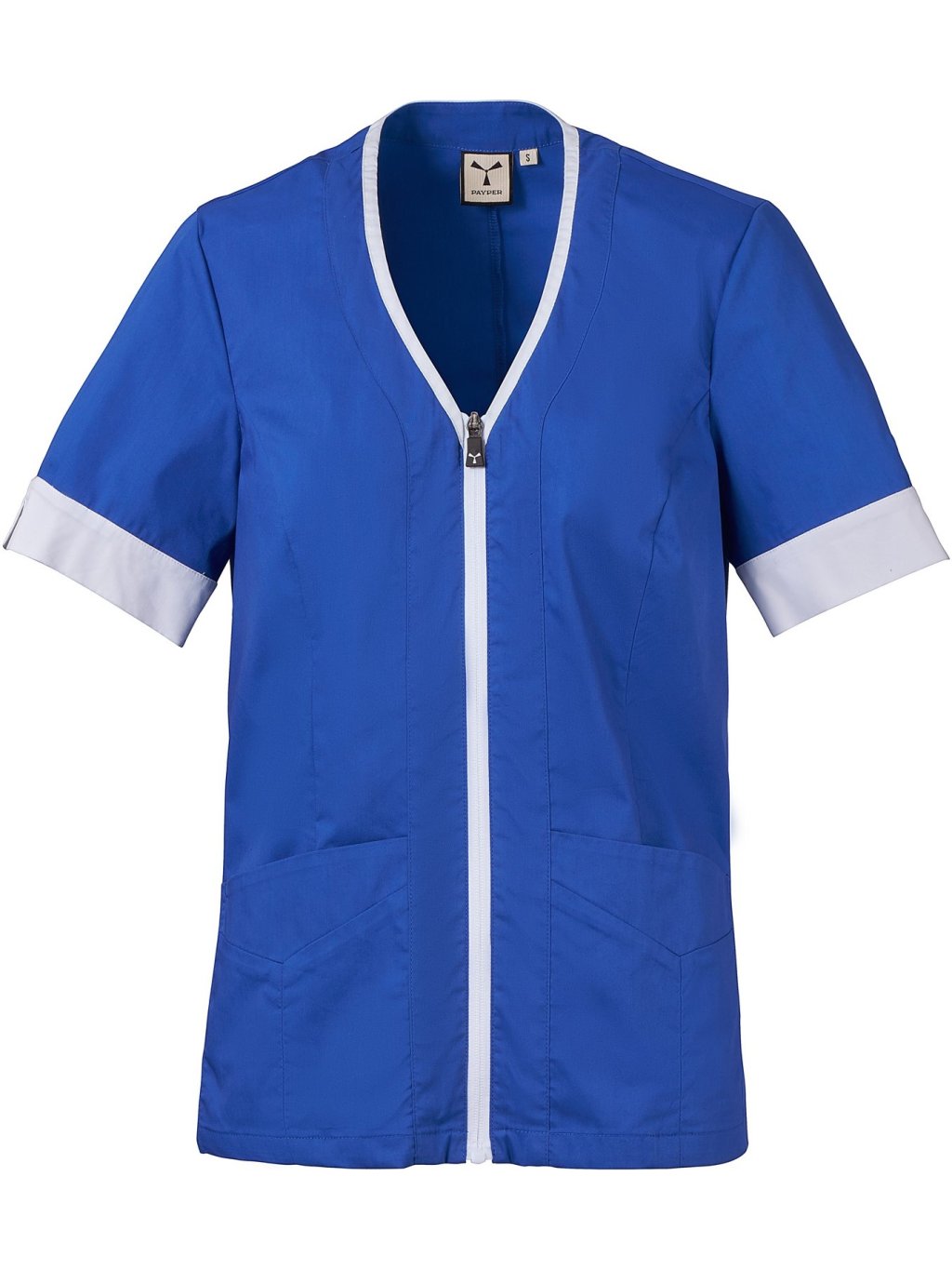 Dámska tunika s krátkymi rukávmi, zo zmesovej tkaniny bavlneného popelínu, polyesteru a vlákna Lycra® T400®, v kombinácii s pohodlnou sieťovinou na bokoch vzadu umožňuje voľnosť pohybu a zaručuje maximálnu priedušnosť. Výstrih do V ukončený lemom kontrastnej farby. Zapínanie na zips v strede a jazdec „semi auto-lock“ kontrastnej farby. Dve našité vrecká v dolnej časti s chlopňou. Rukávy s lemom kontrastnej farby, pričom na jednom je vyšitá ikona vrtule Payper v rovnakej farbe.