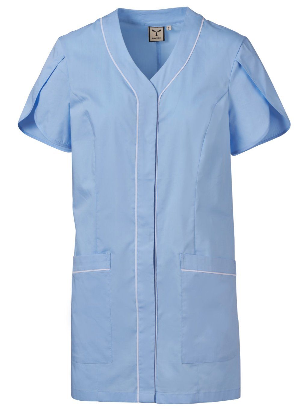 Dámska tunika s krátkymi tulipánovými rukávmi s výstrihom v tvare V, zo zmesovej tkaniny bavlneného popelínu, polyesteru a vlákna Lycra® T400®, v kombinácii s pohodlnou sieťovinou na bokoch zaručuje maximálnu priedušnosť a voľnosť pohybu. Zakrytá gombíková lišta v strede. Dve veľké našité vrecká, pričom na jednom je vyšitá ikona vrtule Payper v rovnakej farbe. Okrajové lemy a vrecká kontrastnej farby. Zadný diel prestrihnutý v strede.