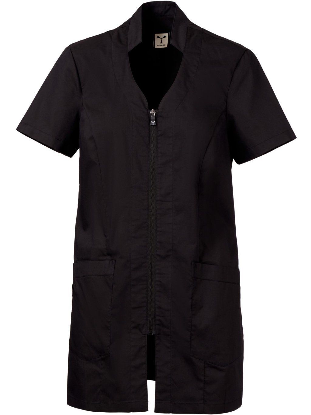 Dámska tunika s krátkymi rukávmi so stojačikom naznačením výstrihu V, zo zmesovej tkaniny bavlneného popelínu, polyesteru a vlákna Lycra® T400®, v kombinácii s pohodlnou sieťovinou na bokoch zaručuje maximálnu priedušnosť a voľnosť pohybu. Zapínanie v strede na zips a prispôsobeným jazdcom. Dve veľké našité vrecká, pričom na jednom je vyšitá ikona vrtule Payper v rovnakej farbe, a vnútorné vrecko na smartfón. Zadný diel prestrihnutý v strede.