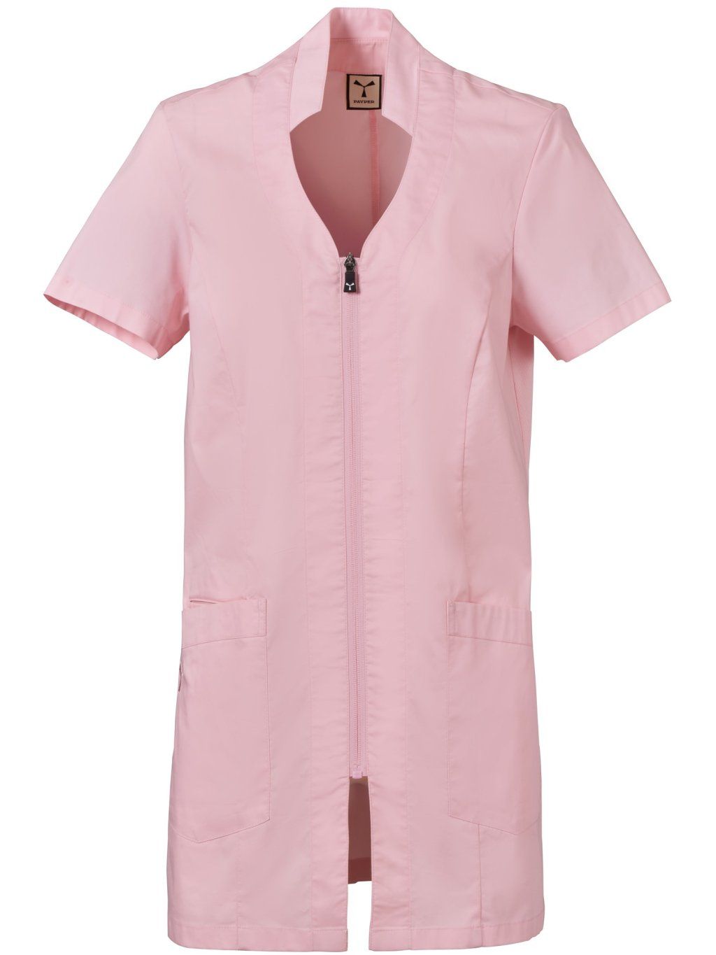 Dámska tunika s krátkymi rukávmi so stojačikom naznačením výstrihu V, zo zmesovej tkaniny bavlneného popelínu, polyesteru a vlákna Lycra® T400®, v kombinácii s pohodlnou sieťovinou na bokoch zaručuje maximálnu priedušnosť a voľnosť pohybu. Zapínanie v strede na zips a prispôsobeným jazdcom. Dve veľké našité vrecká, pričom na jednom je vyšitá ikona vrtule Payper v rovnakej farbe, a vnútorné vrecko na smartfón. Zadný diel prestrihnutý v strede.