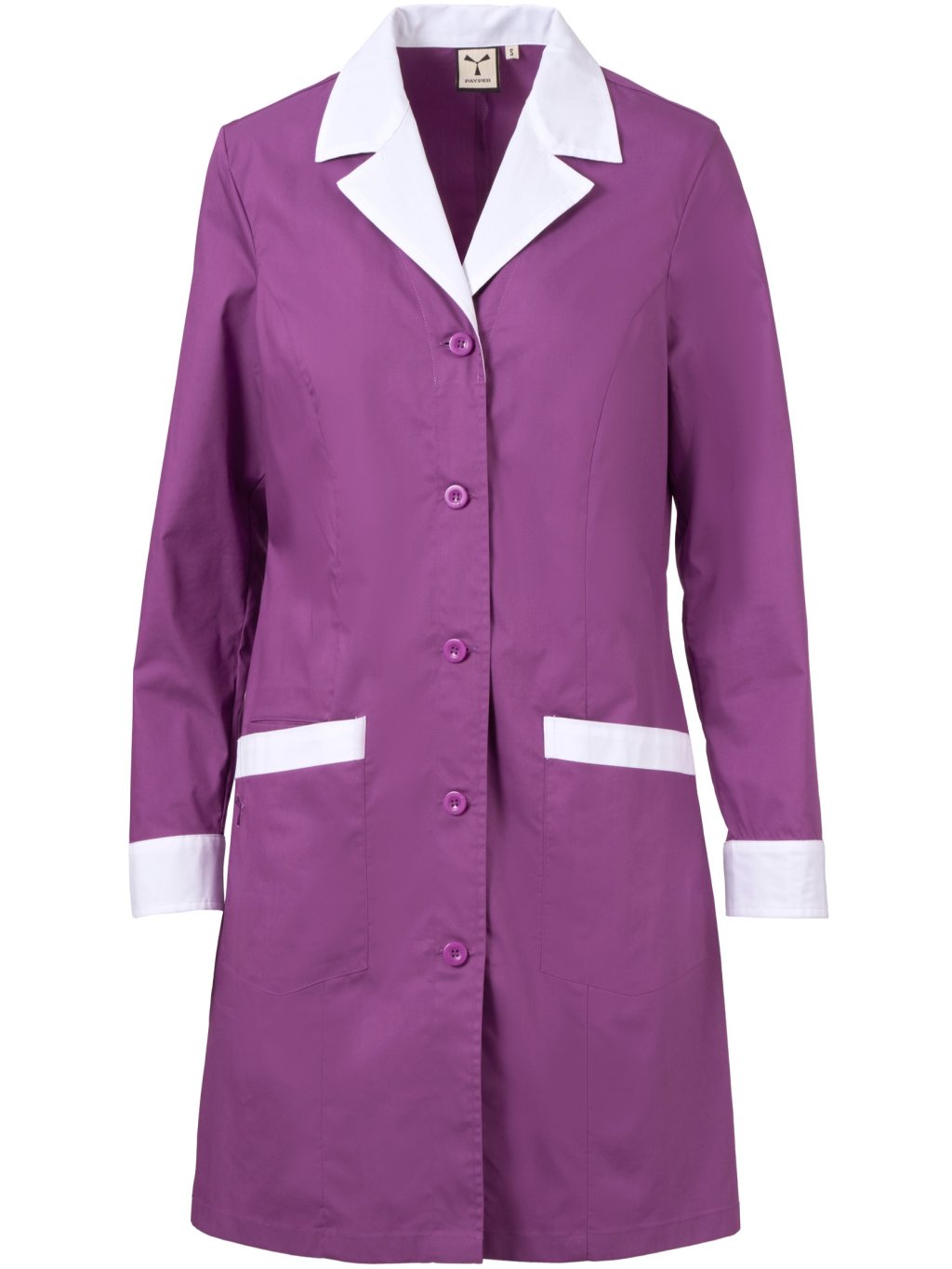 Dámsky dlhý plášť s klasickou fazónkou, zo zmesovej tkaniny bavlneného popelínu, polyesteru a vlákna Lycra® T400®, s vynikajúcimi vlastnosťami, čo sa týka pružnosti a priedušnosti. Zapínanie v strede na gombíky rovnakej farby. Manžety na zapínanie gombíkmi. Dve veľké našité vrecká, pričom na jednom je vyšitá ikona vrtule Payper v rovnakej farbe, a vnútorné vrecko na smartfón. Zadný diel prestrihnutý v strede a bočnými rozparkami. Kontrastné farby na golieri, manžetách a leme vreciek.