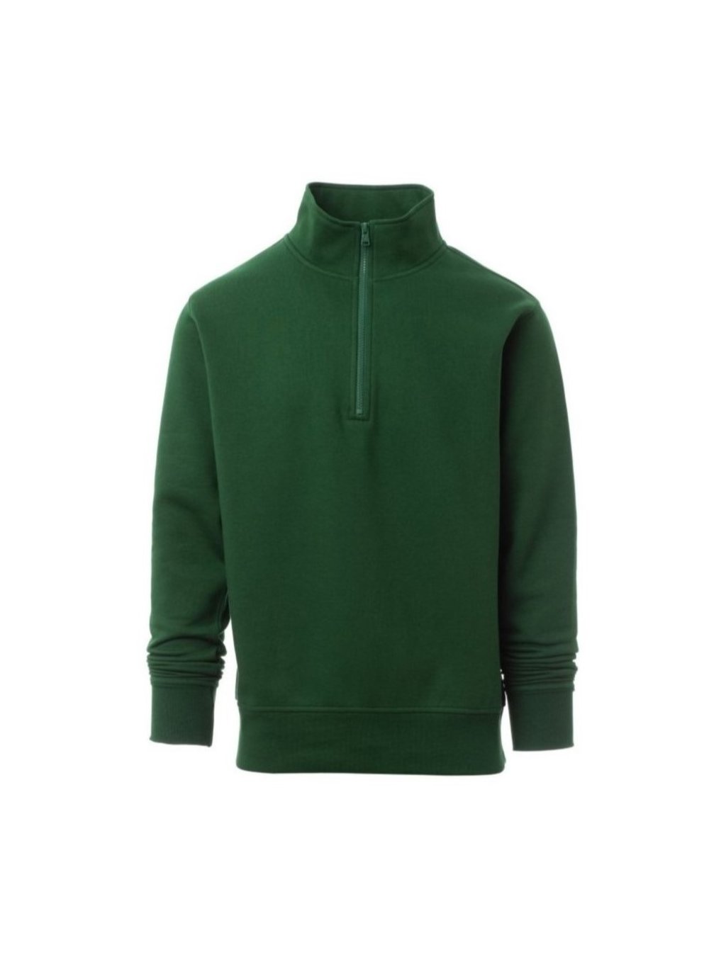 Pánska pracovná mikina, s polovičným plastovým zipsom v rovnakej farbe a s kovovým bežcom, vsadený rukáv, pružné rebrované manžety a pruh v páse, zosilnené švy.
