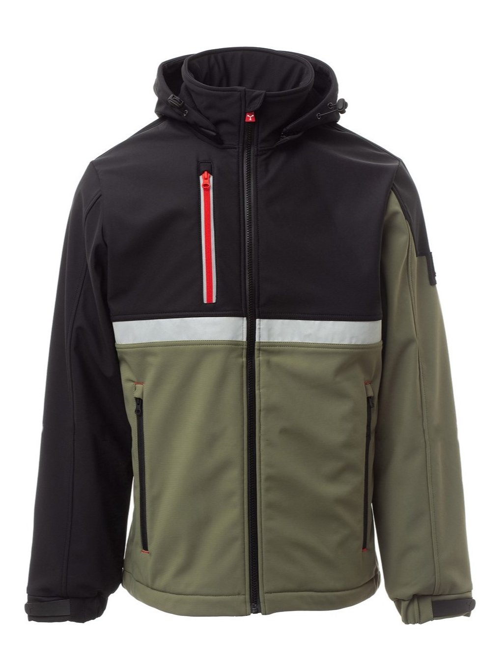 Pánsky 3-vrstvový dvojfarebný softshell, s flísovými vložkami na golieri, SBS zipsom s kovovým bežcom „semi-auto lock“ a ťahačom s logom. Nastaviteľná a odnímateľná kapucňa so zaťahovacou šnúrkou. Reflexný pás na hrudníku. Pružné a nastaviteľné manžety so suchým zipsom. Dve bočné vrecká so zipsom, jedno náprsné vrecko so zipsom a s reflexným prvkom. Prvok „life-saving“ na zadnej strane s reflexným logom so zipsom. Jedno vnútorné vrecko so suchým zipsom na uloženie tabletu. Priedušná podšívka na chrbte. Spodný okraj sa dá nastaviť zarážkami s logom.