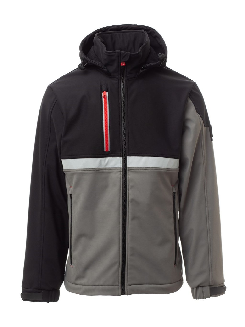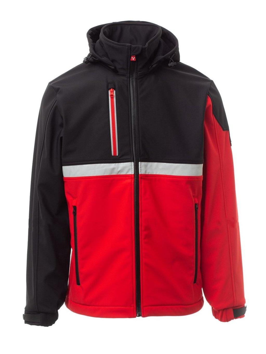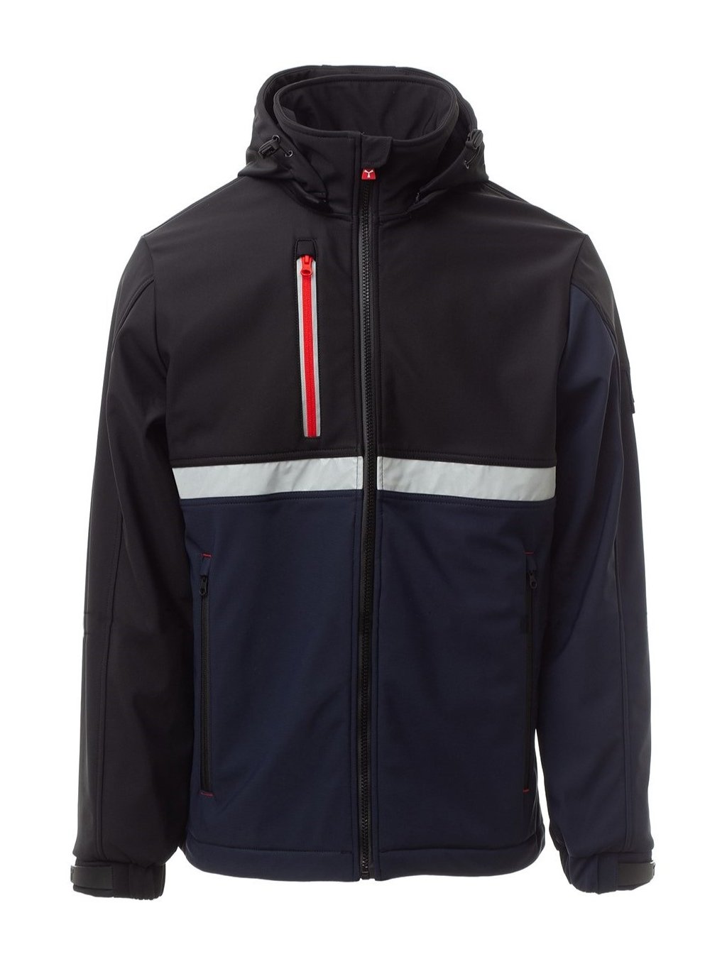 Pánsky 3-vrstvový dvojfarebný softshell, s flísovými vložkami na golieri, SBS zipsom s kovovým bežcom „semi-auto lock“ a ťahačom s logom. Nastaviteľná a odnímateľná kapucňa so zaťahovacou šnúrkou. Reflexný pás na hrudníku. Pružné a nastaviteľné manžety so suchým zipsom. Dve bočné vrecká so zipsom, jedno náprsné vrecko so zipsom a s reflexným prvkom. Prvok „life-saving“ na zadnej strane s reflexným logom so zipsom. Jedno vnútorné vrecko so suchým zipsom na uloženie tabletu. Priedušná podšívka na chrbte. Spodný okraj sa dá nastaviť zarážkami s logom.