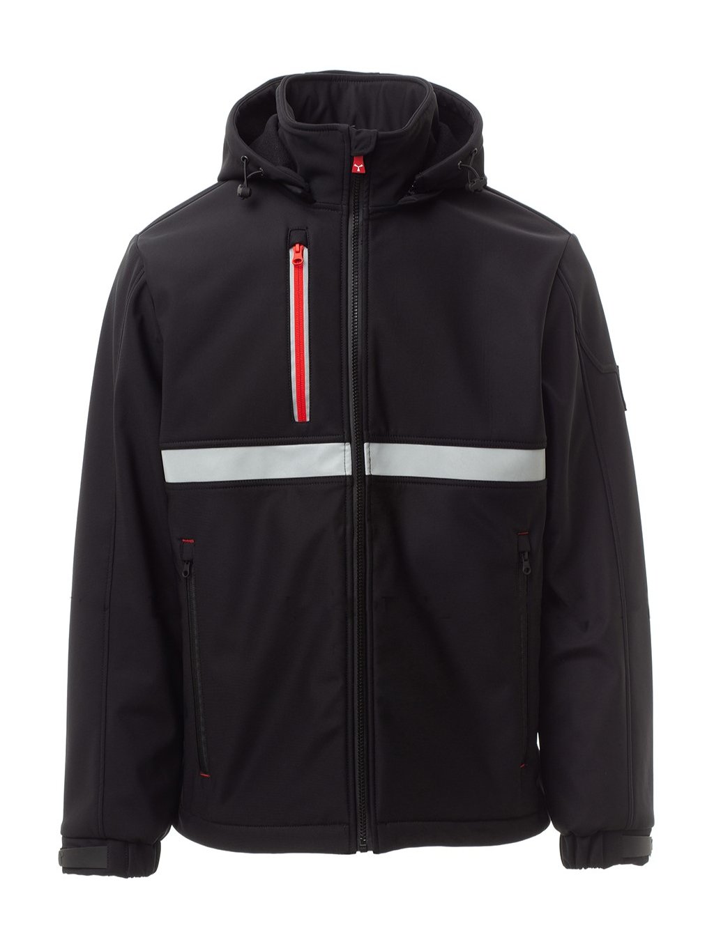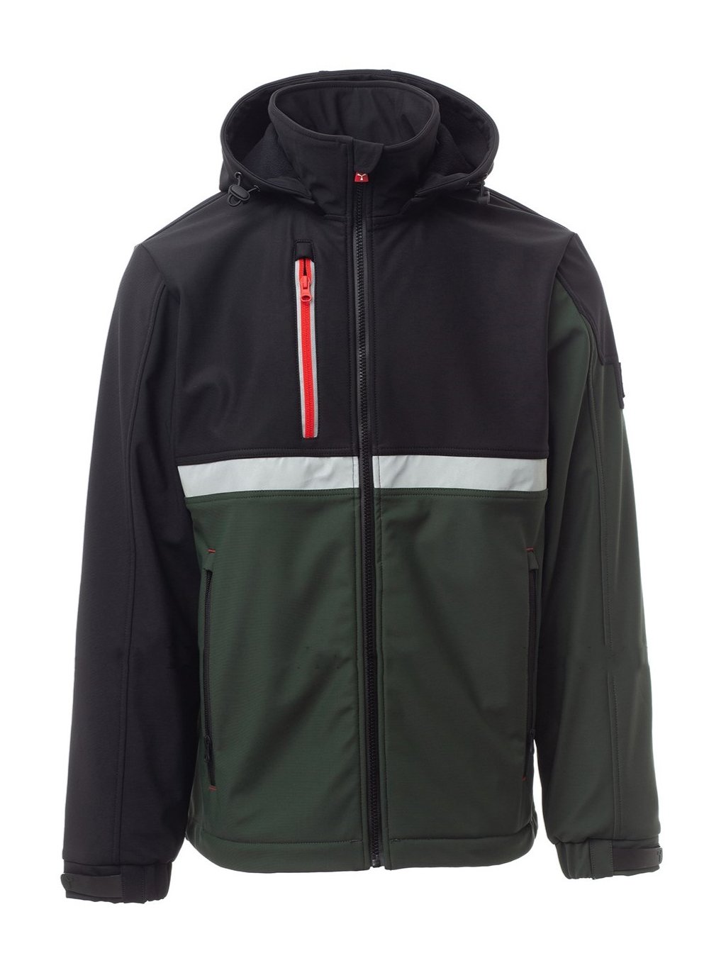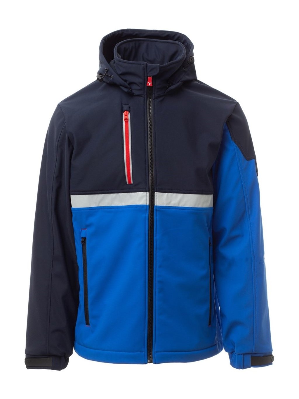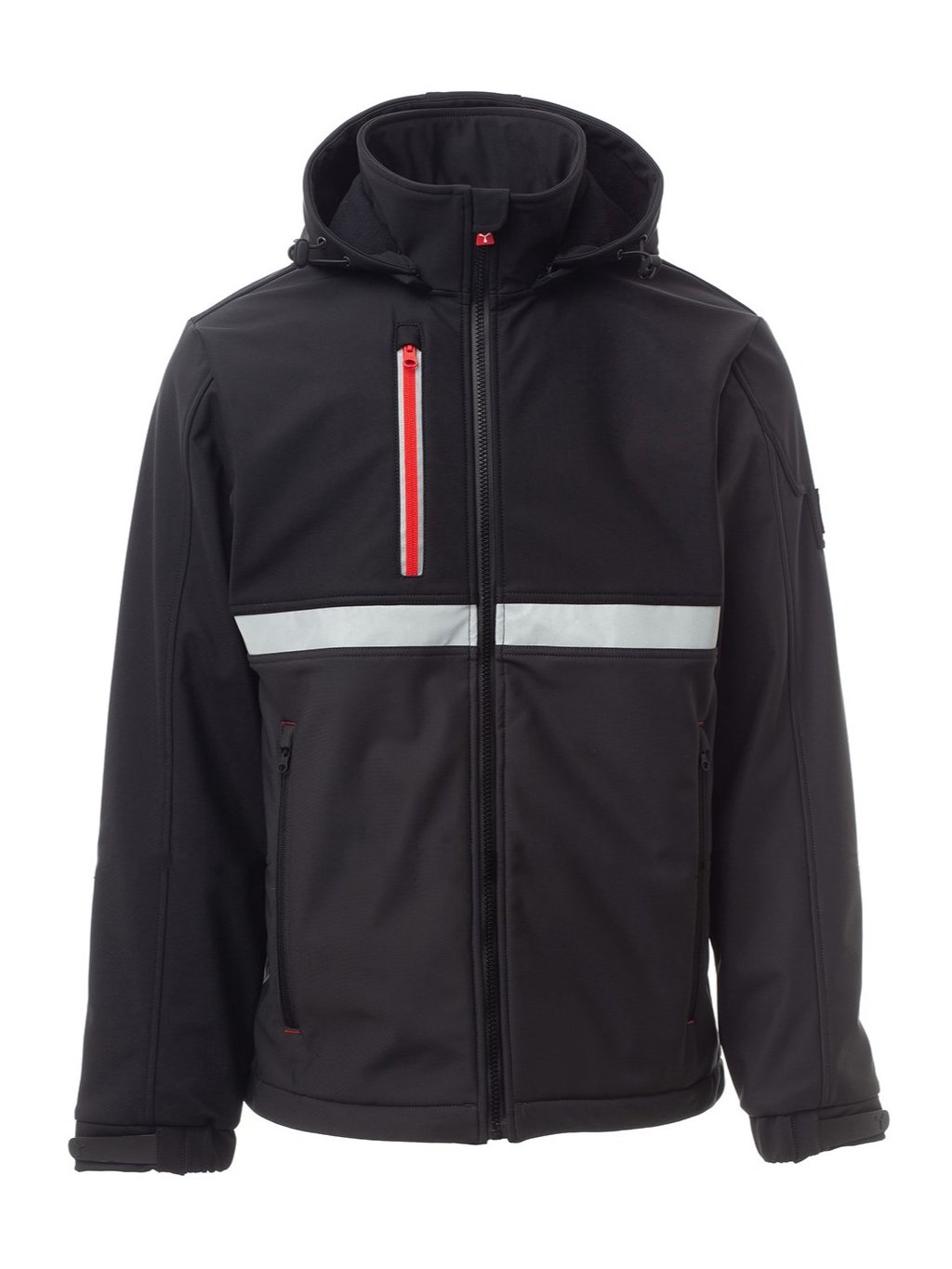 Pánsky 3-vrstvový dvojfarebný softshell, s flísovými vložkami na golieri, SBS zipsom s kovovým bežcom „semi-auto lock“ a ťahačom s logom. Nastaviteľná a odnímateľná kapucňa so zaťahovacou šnúrkou. Reflexný pás na hrudníku. Pružné a nastaviteľné manžety so suchým zipsom. Dve bočné vrecká so zipsom, jedno náprsné vrecko so zipsom a s reflexným prvkom. Prvok „life-saving“ na zadnej strane s reflexným logom so zipsom. Jedno vnútorné vrecko so suchým zipsom na uloženie tabletu. Priedušná podšívka na chrbte. Spodný okraj sa dá nastaviť zarážkami s logom.
