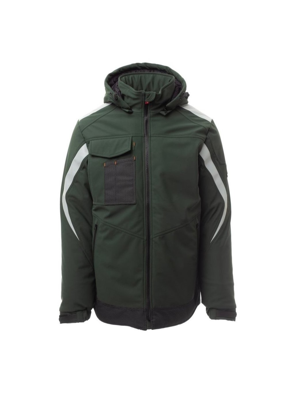Pánska zimná softshellová pracovná bunda s výplňou, s SBS zipsom s kovovým poloautomatickým bežcom a ťahačom s logom. Nastaviteľná a odnímateľná kapucňa so zaťahovacou šnúrkou. Reflexný pás na pleciach a ramenách. Elastické a nastaviteľné manžety so suchým zipsom a vnútornou manžetou. Náprsné vrecko typu Lock System s chlopňou a držiakom na perá. Dve bočné vrecká s potiahnutým zipsom. Prvky „life-saving“ na zadnej strane s reflexným logom s potiahnutým zipsom. Dve vnútorné vrecká, z toho jedno so suchým zipsom určené pre tablet a druhé tvarované so zipsom na pravej strane. Zadná strana je nastaviteľná za pomoci zarážky s logom. Tkanina s reflexným účinkom. WP 8000 mm H₂O, WVT 5000 g/m² 24h.