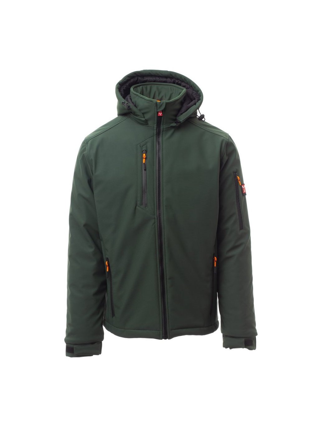 Pánsky softshell s výplňou, s SBS zipsom s kovovým poloautomatickým bežcom a ťahačom s logom. Nastaviteľná a odnímateľná kapucňa so zaťahovacou šnúrkou. Flísová vnútorná strana goliera s bočnými prvkami. Reflexné pásy na chrbte a zadnej časti kapucne. Elastické a nastaviteľné manžety so suchým zipsom. Dve bočné vrecká so zipsom, jedno náprsné vrecko je s potiahnutým zipsom a druhé na ľavom ramene má integrovaný držiak na perá so zipsom. Fluoreskujúce ťahače. Jedno vnútorné lemované vrecko so suchým zipsom. Zadná strana je nastaviteľná za pomoci zarážky s logom.