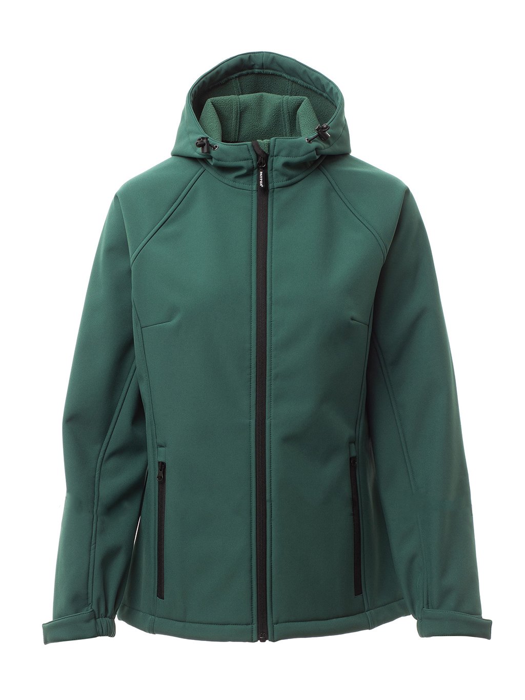 Dámska pracovná ergonomická bunda s raglánovým rukávom, tvarovaná kapucňa s dvojitým štepovaním a s tunelom so šnúrkou, dlhý zips zakrytý légou, manžety s gumičkou a zapínaním na suchý zips, dve vonkajšie vrecká so zipsom. WP/MM 8000 MVP/GR 3000. Vnútro: flíc.