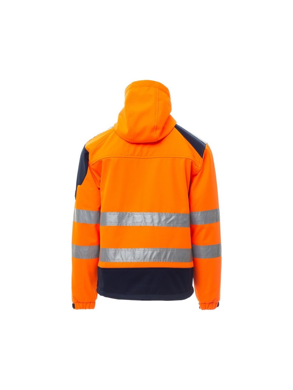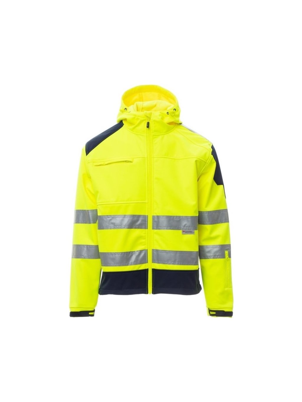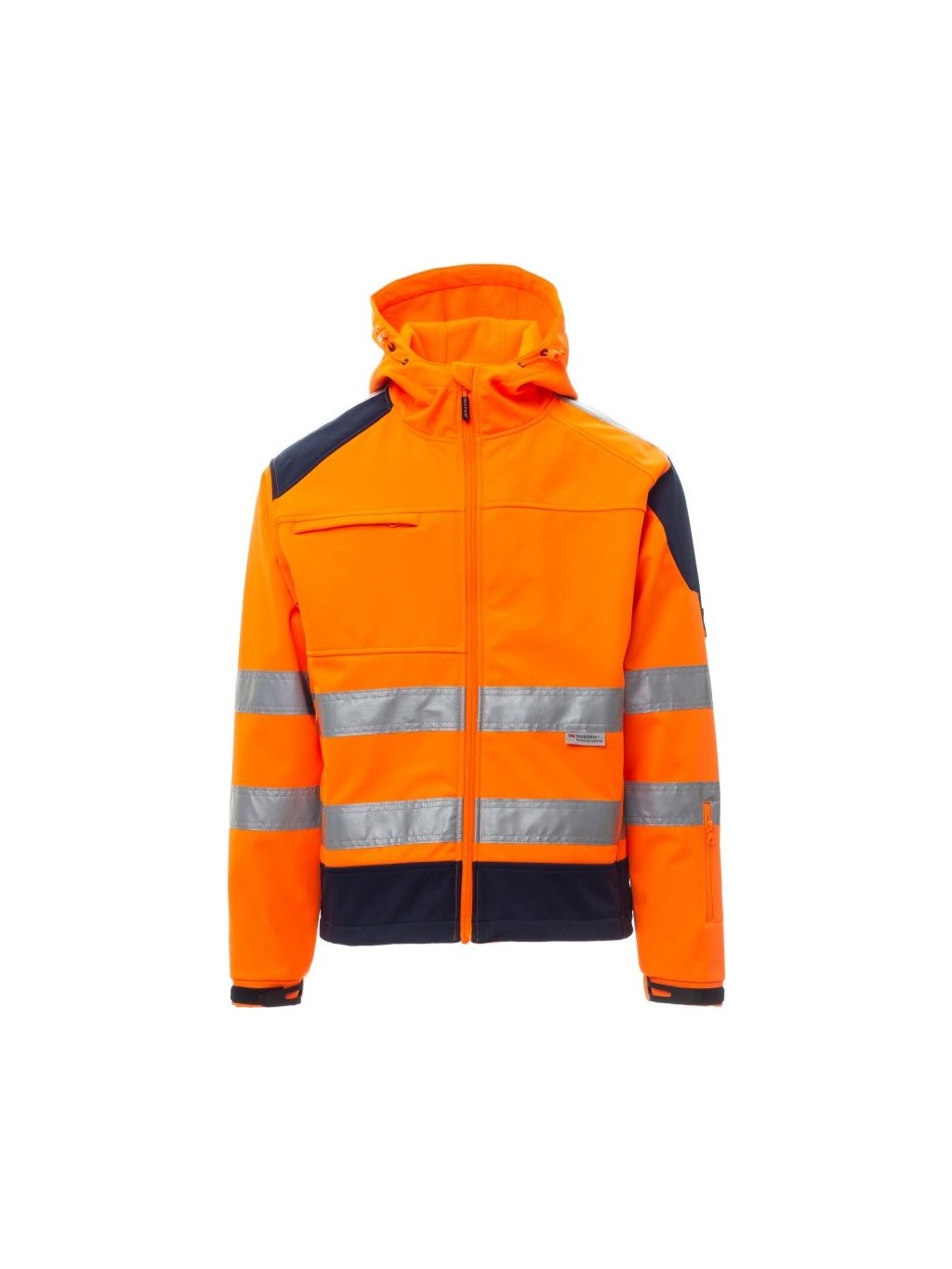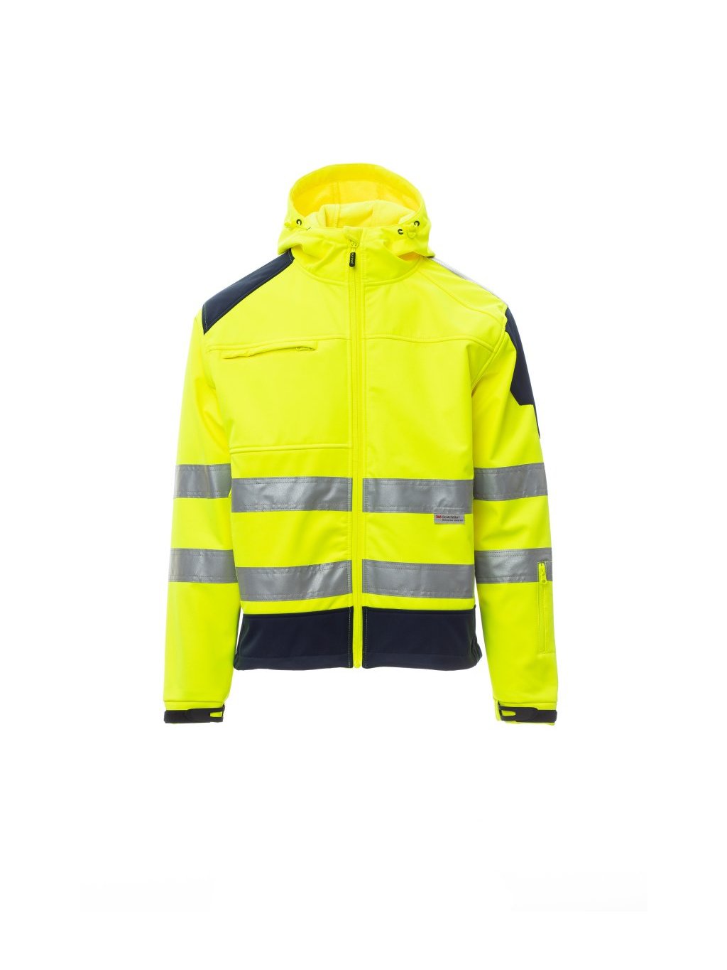 Pánska ergonomická dvojfarebná bunda s dobrou viditeľnosťou s pásmi 3M, raglánové rukávy, tvarovaná kapucňa s dvojito prešívanými švami a zaťahovacou šnúrkou, dlhý zips z SBS s páskou, nastaviteľné manžety so zapínaním na suchý zips, dve bočné vrecká so zipsom, jedno náprsné vrecko, odnímateľný a zapnuteľný držiak na preukaz a vrecko na ľavom ramene.