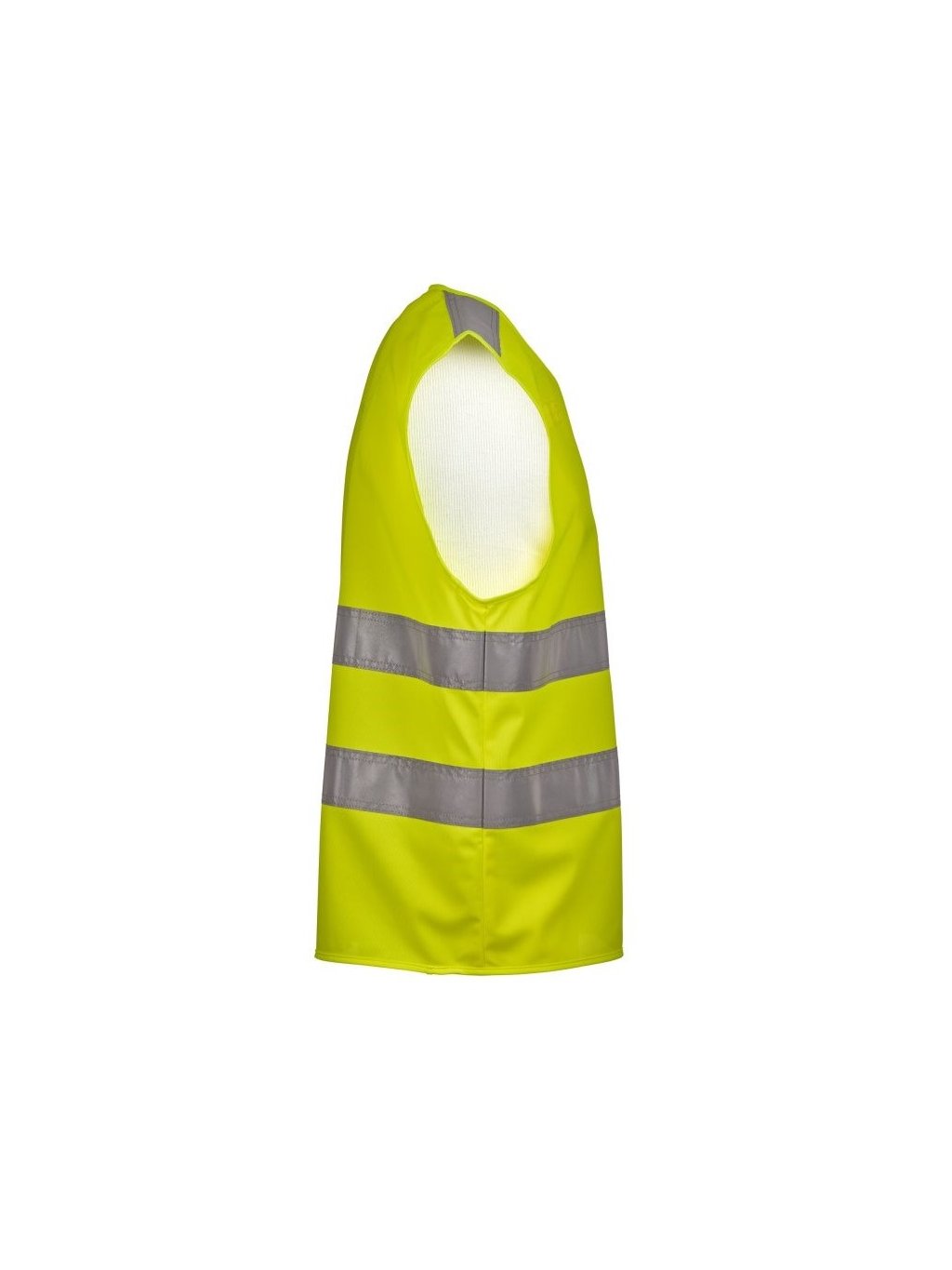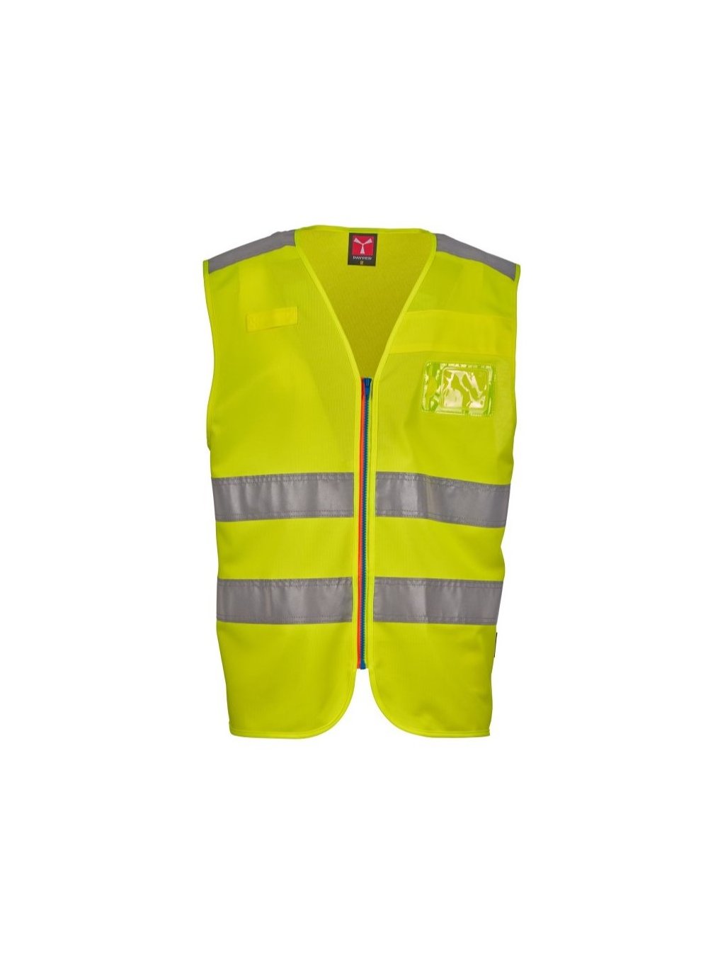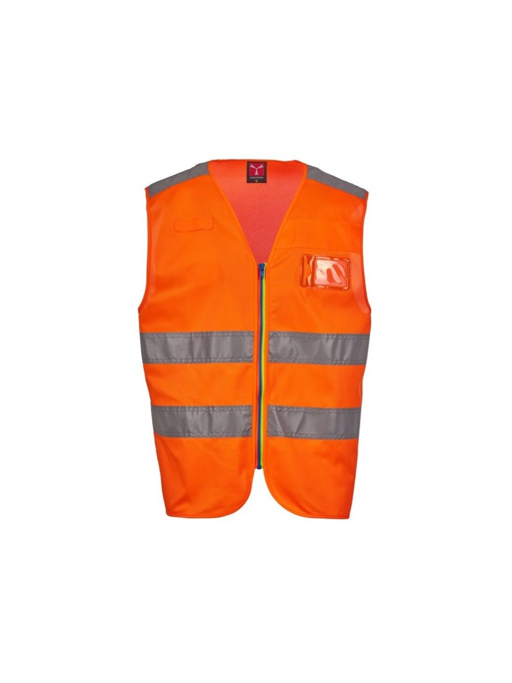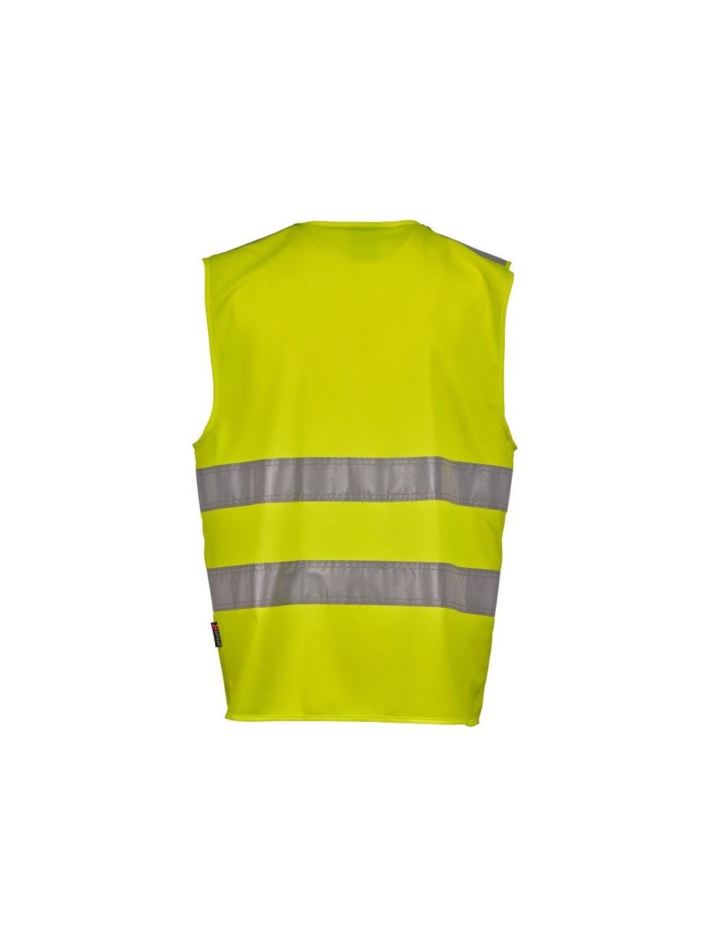 Vesta s vysokou viditeľnosťou z tkaniny dry-tech, s odrazovými pásmi na pleciach a na tele. Zapínanie na zips s dvojfarebnou páskou. Pás z tkaniny dry-tech na prispôsobenie a pevný držiak na preukaz na ľavej strane hrudníka po oblečení odevu. Viacfunkčný tunel na pravej strane hrudníka po oblečení odevu.