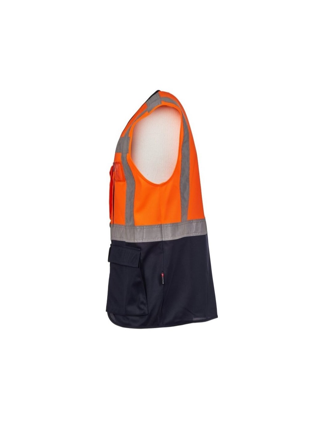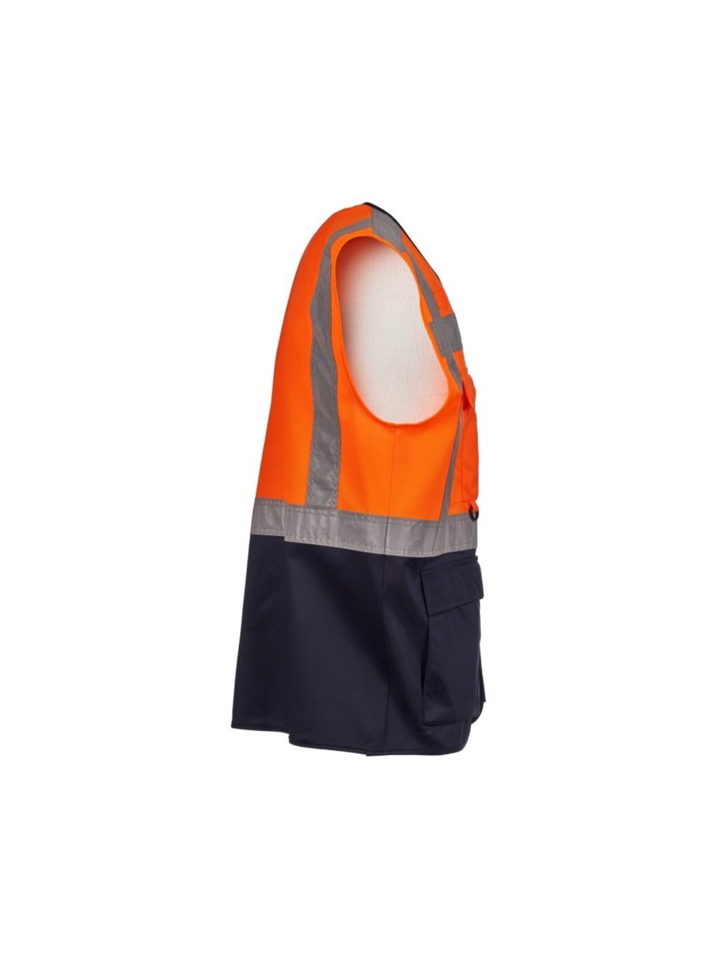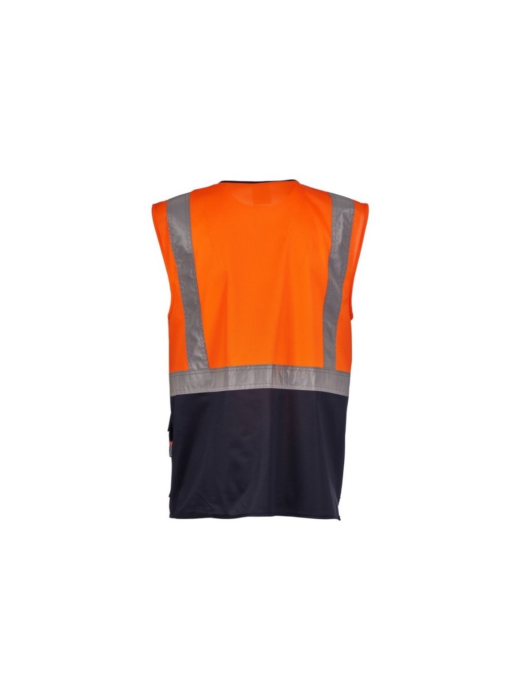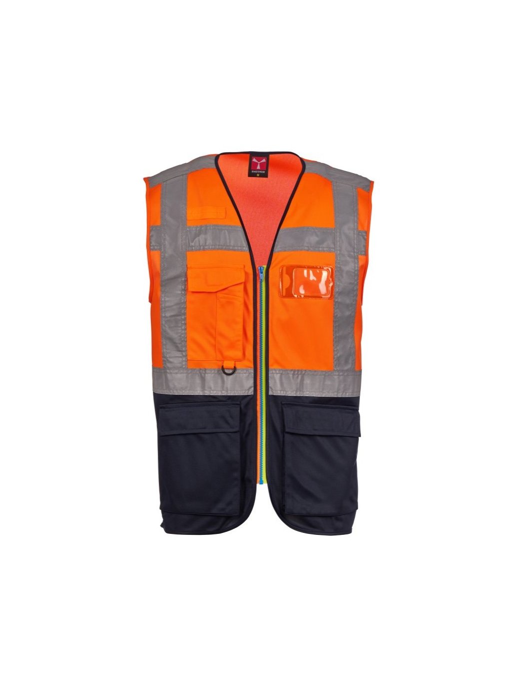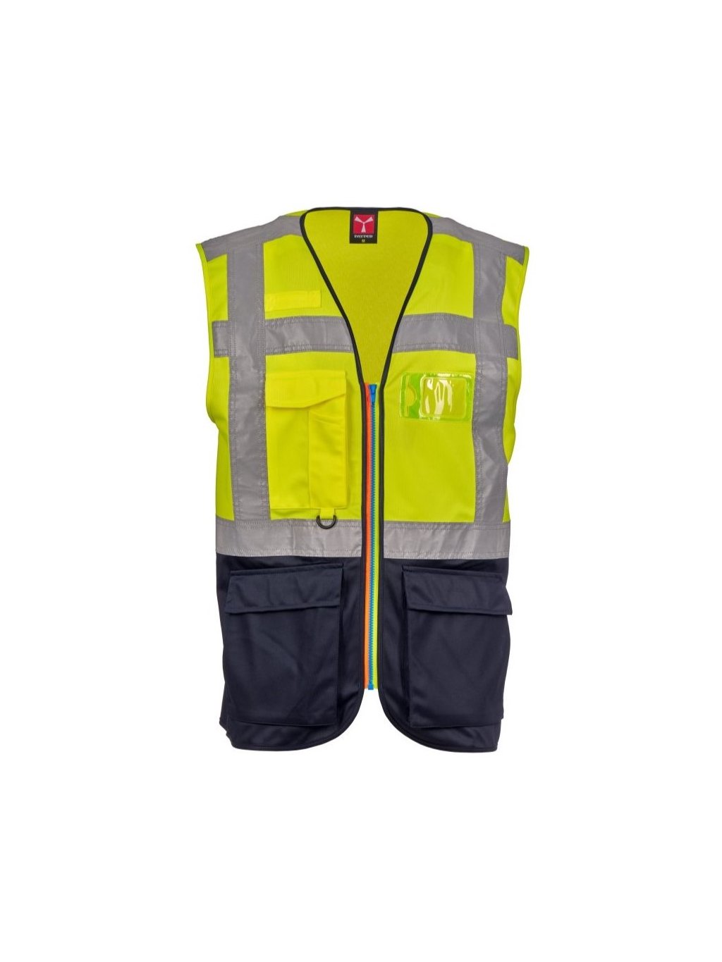 Vesta s vysokou viditeľnosťou z tkaniny dry-tech, spodná časť kontrastnej farby. Odrazové pásy na pleciach, na hrudi a v páse, a dva vertikálne odrazové pásy. Zapínanie na zips, s dvojfarebnou páskou. Pevný držiak na preukaz na ľavej strane hrudníka po oblečení odevu. Viacfunkčný tunel, vrecko s držiakom na perá zatvorené na suchý zips a krúžok na pravej strane hrudníka po oblečení odevu. Dve vrecká s chlopňou zatvorené na suchý zips s otvorom na boku na dne.