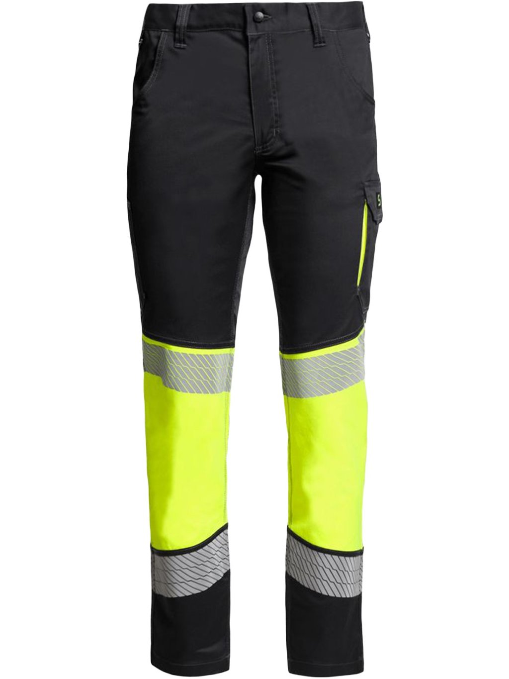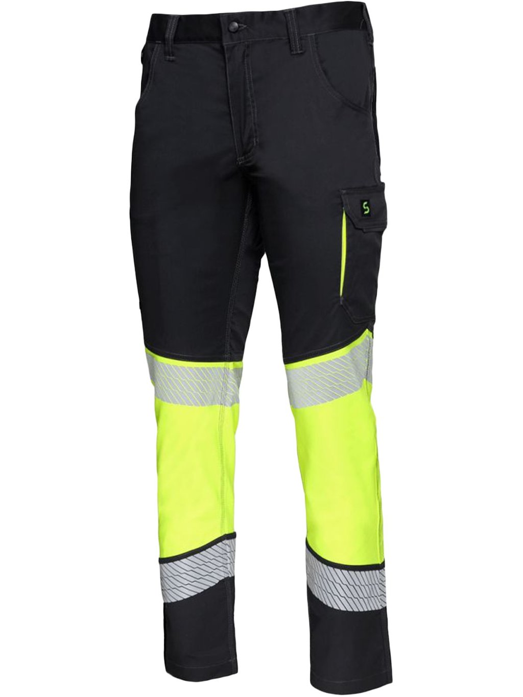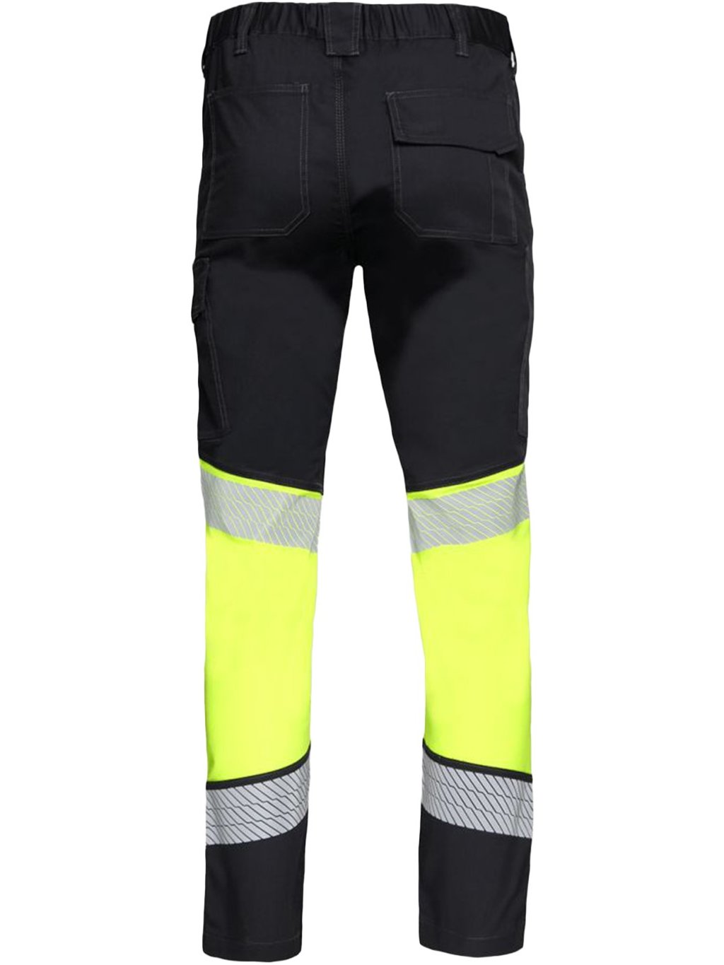 Vysoko viditeľné pracovné nohavice vyrobené z ľahkej strečovej tkaniny pre pohodlie a viditeľnosť.