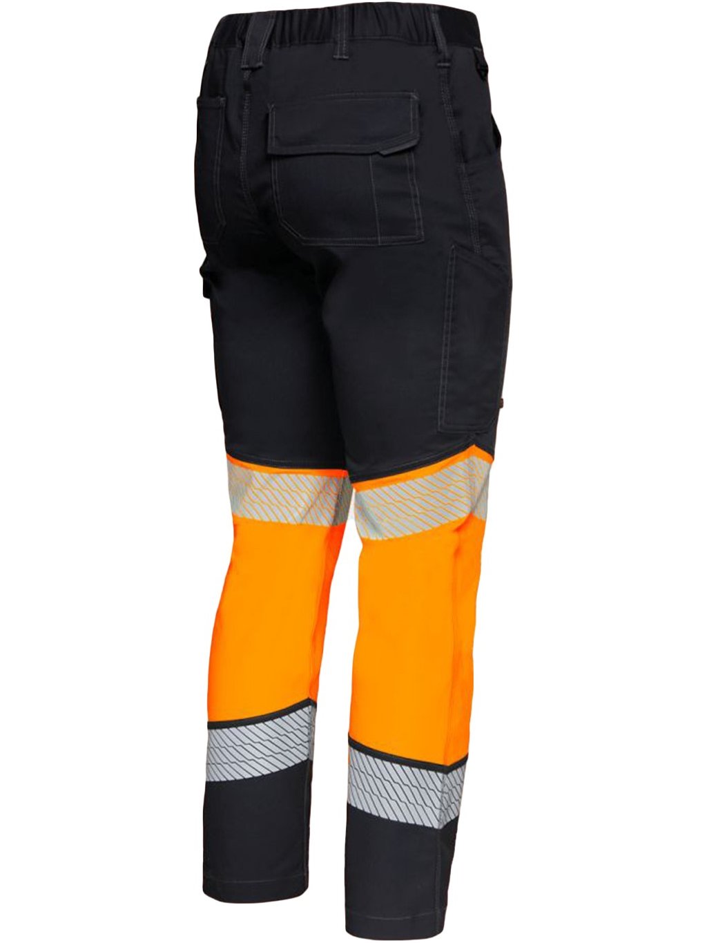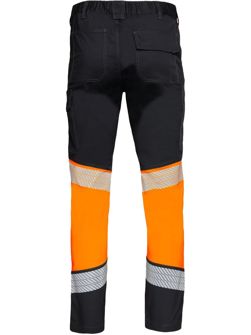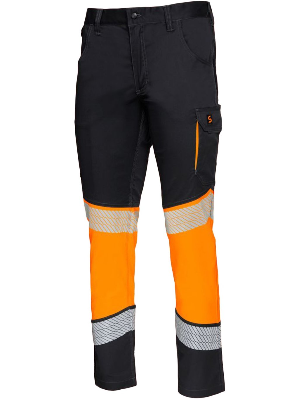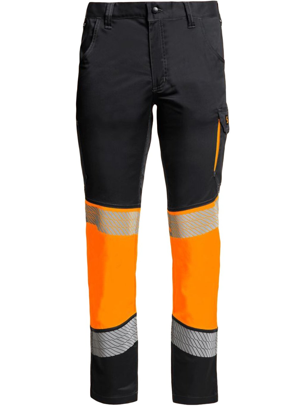 Vysoko viditeľné pracovné nohavice s kontrastným čiernym a fluorescenčným oranžovým dizajnom, ideálne pre podmienky so slabým osvetlením.