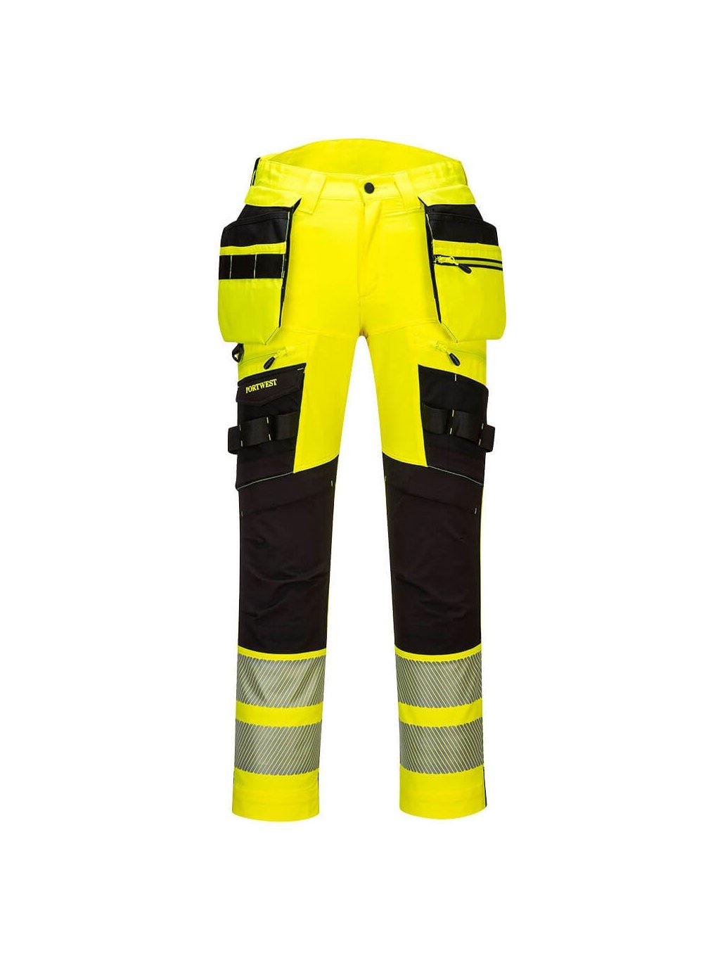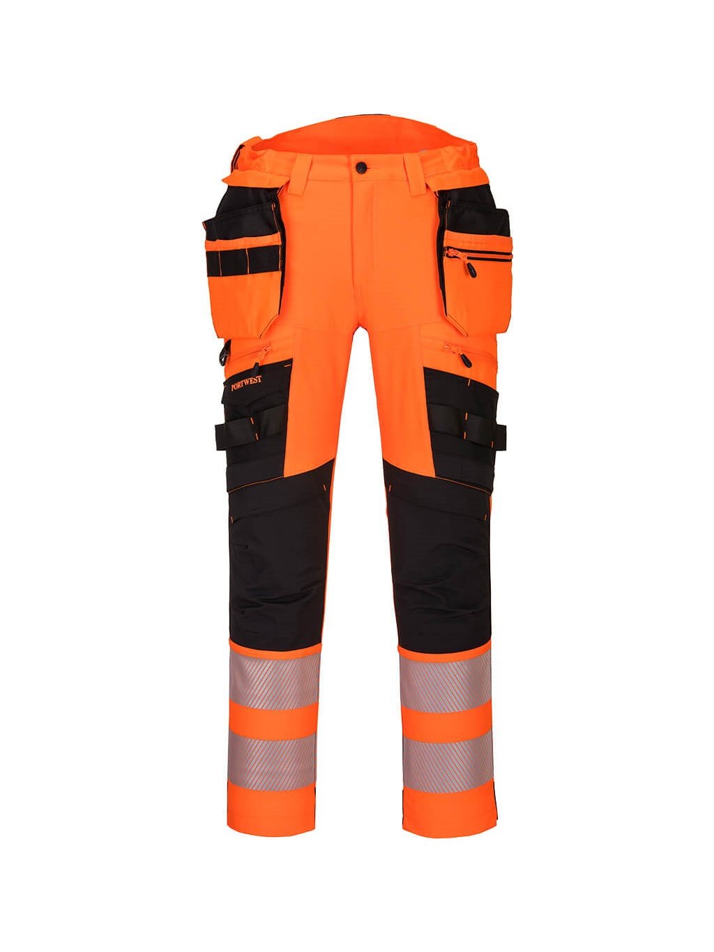 DX4 Hi-Vis odnímateľné vreckové nohavice sú ergonomicky tvarované a využívajú cielené umiestnenie dynamických 4X strečových látok, aby pri práci poskytli maximálny rozsah pohybu. Nohavice majú vysoko položený zadný pás s bočnou elastikou, ktorá zaisťuje ochranu vo všetkých pracovných pozíciách. Predohnuté nastaviteľné vrecká na kolená s horným plnením, veľkoryso dimenzované predné vrecká a multifunkčné vrecká na stehná ponúkajú bezpečné uloženie. Trojité prešívanie pre maximálnu odolnosť.