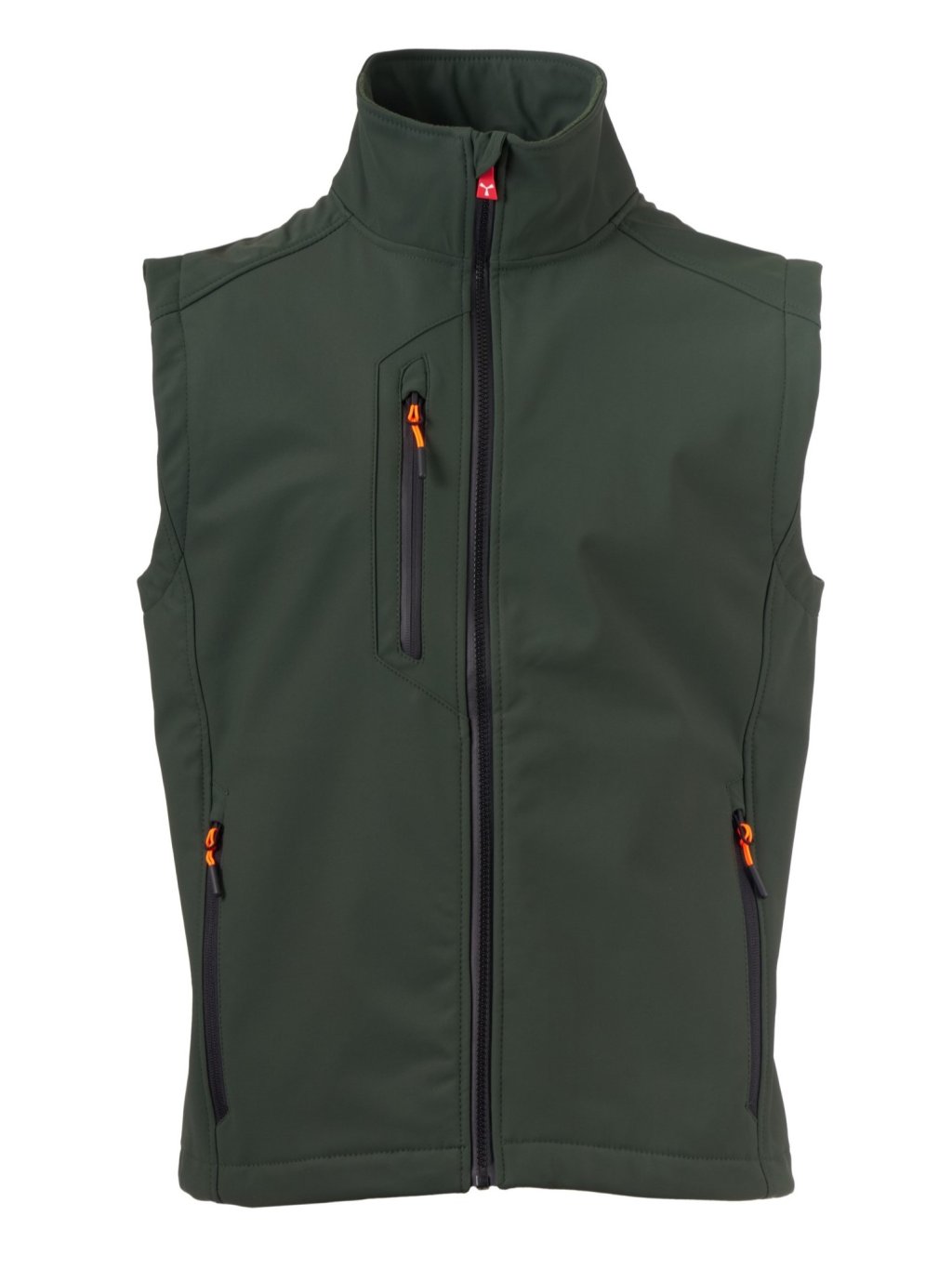 Pánska 3-vrstvová softshellová vesta, zapínanie na SBS zips s kovovým bežcom „semi-auto lock“ a ťahačom s logom. Reflexný pruh na zadnom spodnom okraji. Dve bočné vrecká so zipsom, jedno náprsné vrecko je s potiahnutým zipsom. Fosforeskujúce ťahače. Jedno vnútorné lemované vrecko zatvorené na suchý zips. Spodný okraj sa dá nastaviť zarážkou s logom.