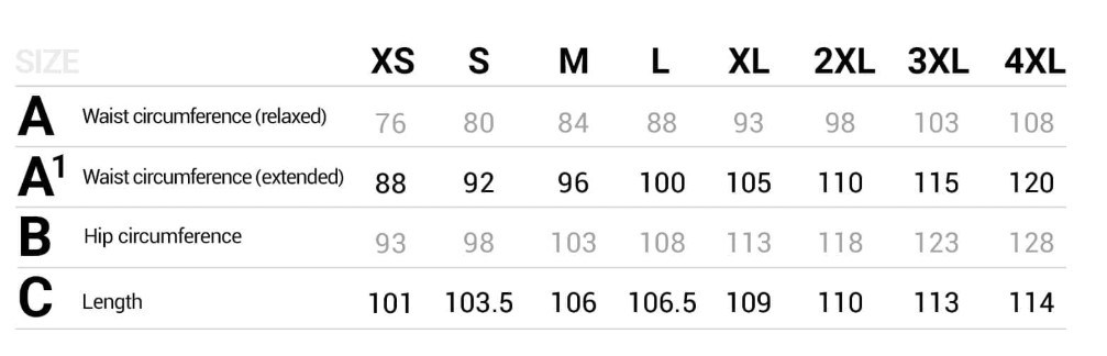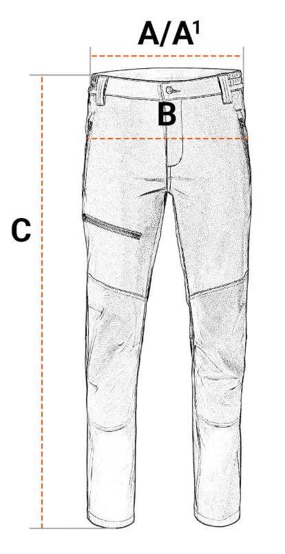 • Dve bočné vrecká, jedno vrecko na pravom stehne a jedno zadné vrecko.